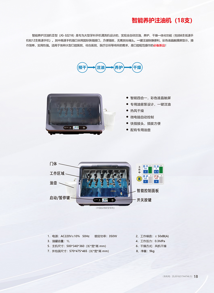 1.该机器由微电脑控制,触摸屏显示,可智能对各种牙科手机进行预干,注油、养护,干燥,四步程序可分别设置 养护程序深化油脂浸润,精心呵护每一只牙科手机
